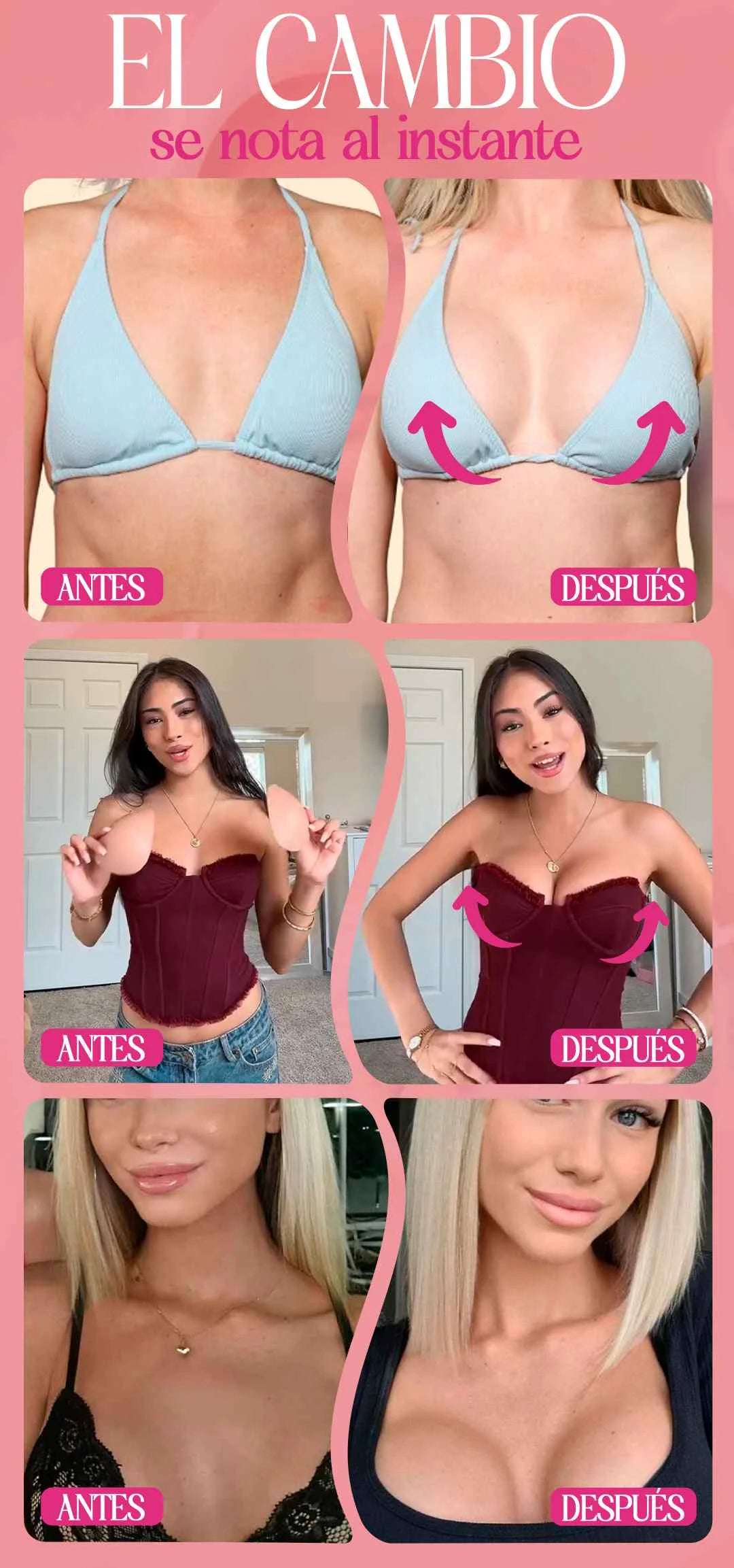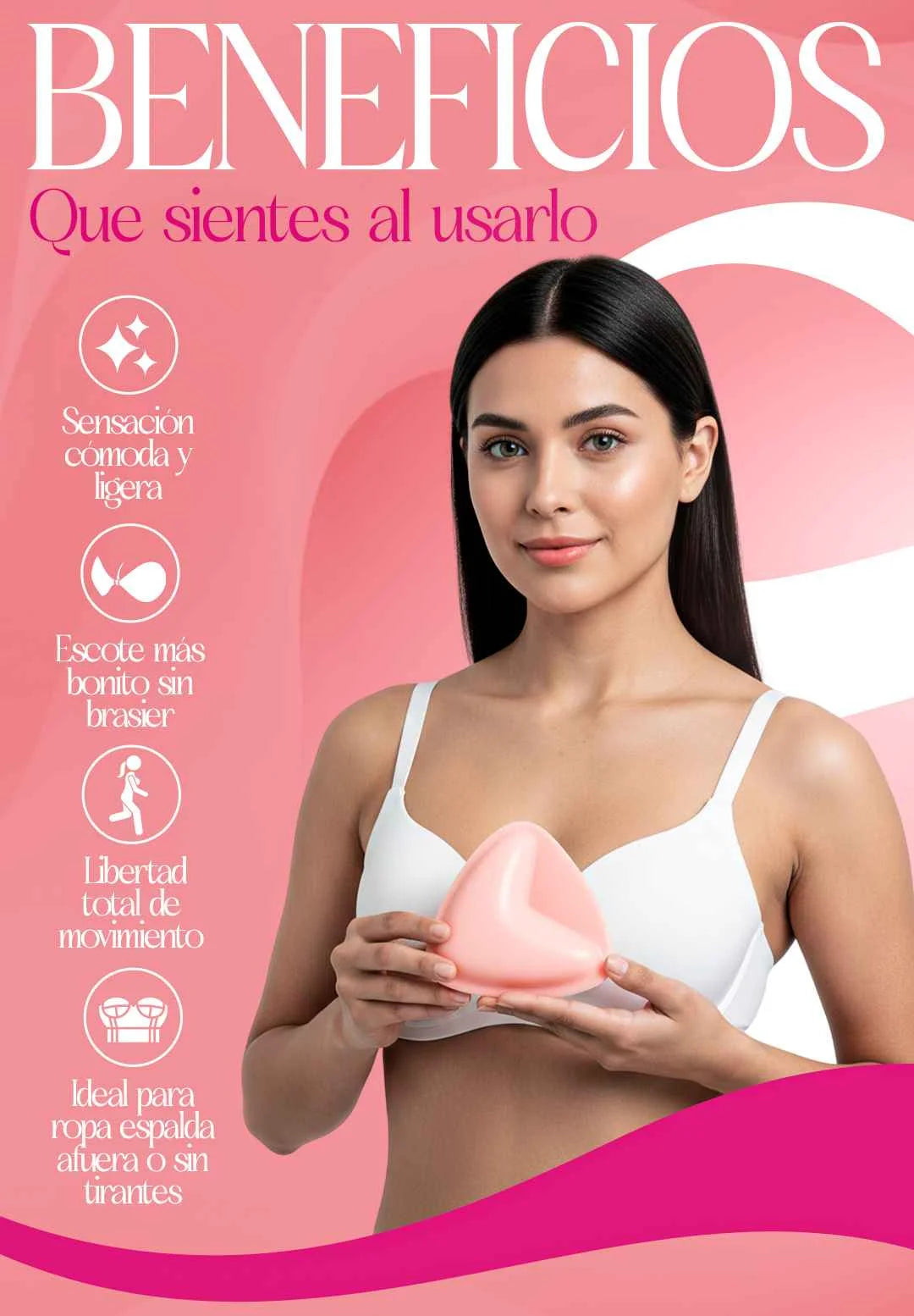 Nuestro brasier adhesivo premium crea un escote en V profundo, firme y natural, sin tirantes, sin dañar tu espalda y sin incomodidad.