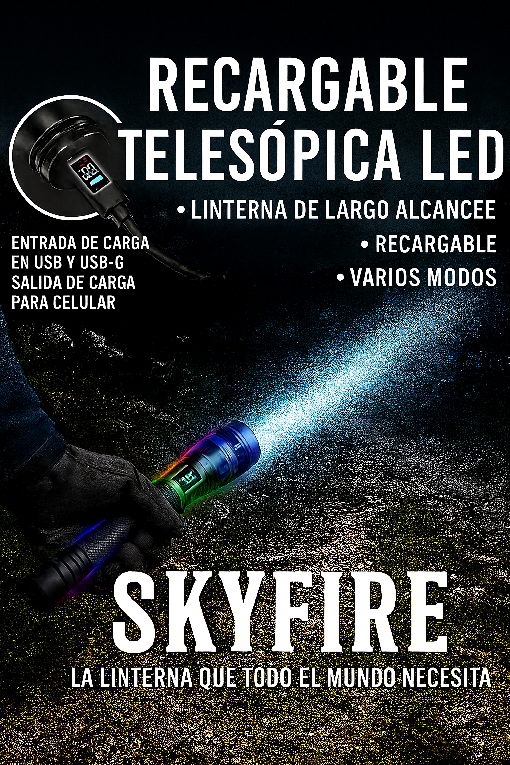 🔦⚡ SKYFIRE™ LINTERNA TELESCOPICA + PANTALLA DE CARGA 🔋| BATERÍA DE LITIO